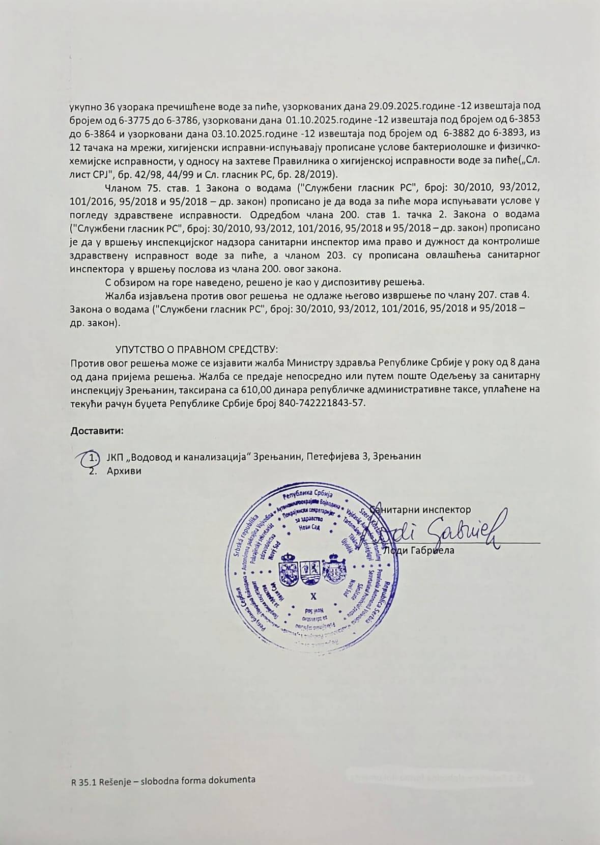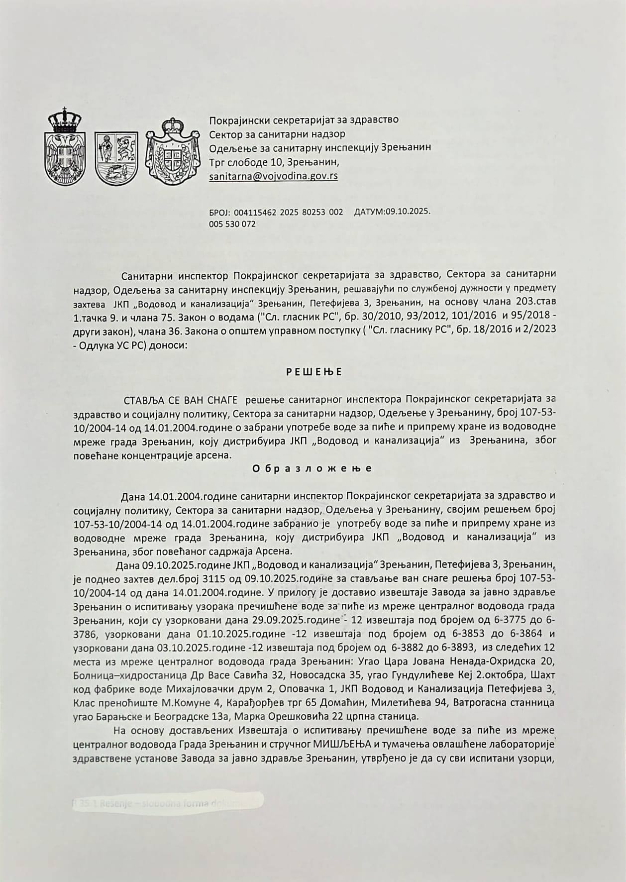 Na svom zvaničnom Fejsbuk profilu, gradonačelnik Zrenjanina, Simo Salapura je objavio rešenje koje je izdao Pokrajinski sekretarijat za zdravstvo i socijalnu politiku Sektora za santirani nadzor, Odeljenje u Zrenjaninu, kojim se stavlja van snage rešenje o zabrani upotrebe vode za piće i pripremu hrane iz vodovodne mreže Grada Zrenjanina, od 14. januara 2004. godine, a koje je tada doneto zbog povećane koncentracije arsena.